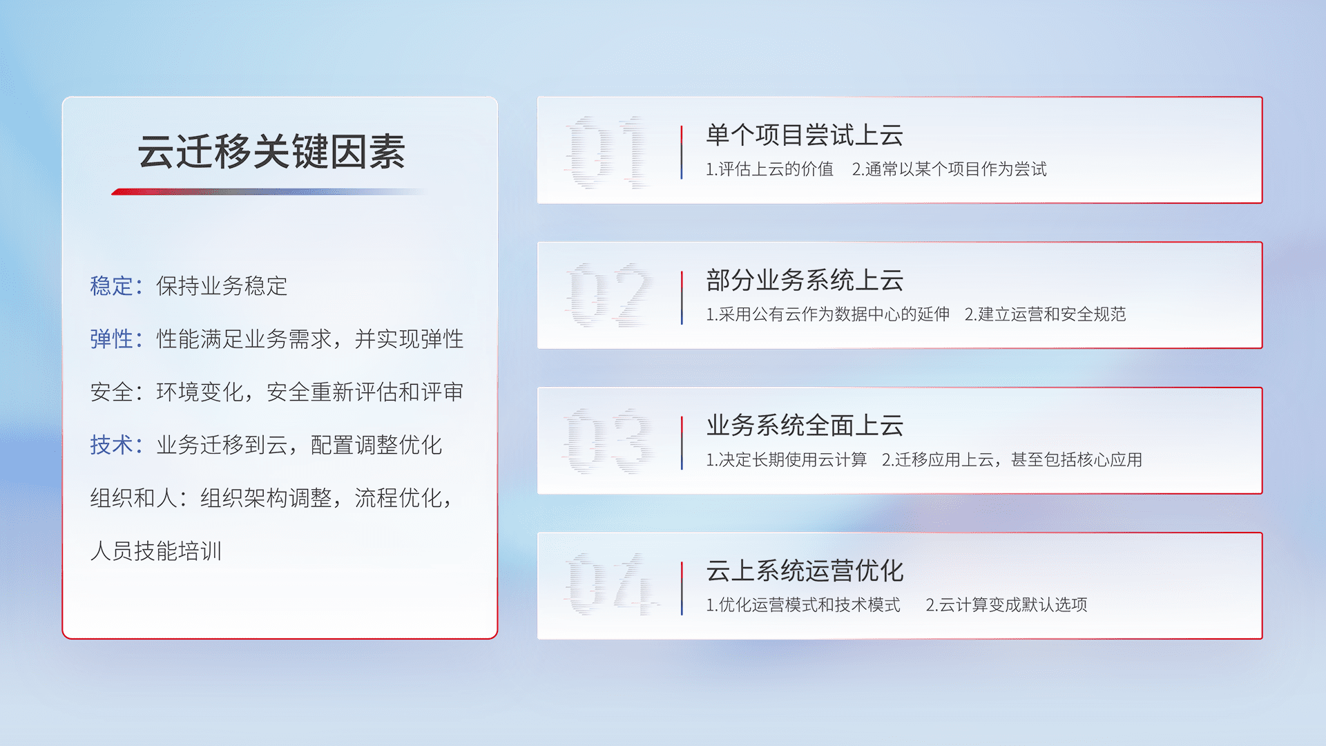 结合实际业务,,从规划设计、、云平台选型、、、云原生改造、、数据迁移、、、集成交付,,,,迁移全过程为客户识别最佳上云路径,,,做好风险识别管理,,,,设计网络架构、、、、身份权限、、、安全审计合规、、、、操作审计、、、日志审计、、、监控告警策略、、、、多站点容灾设计等,,,对云上基础设施进行整体规划,,,提升IT治理水平,,,,以满足弹性、、、高可用、、高性能的需求。。。。